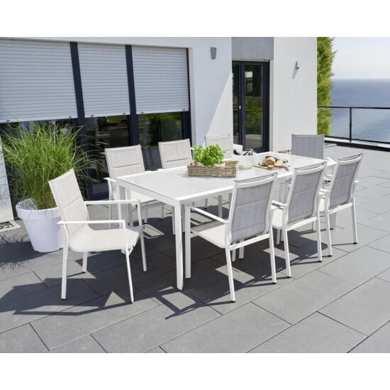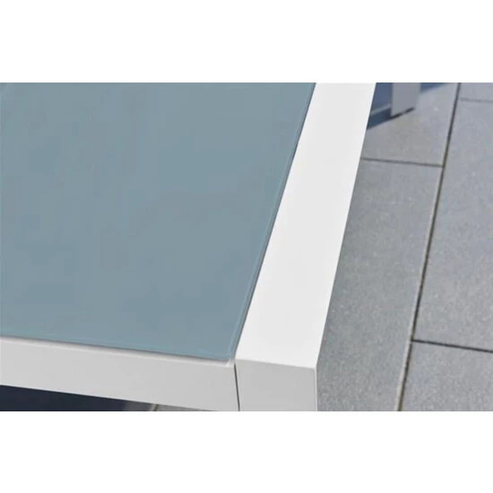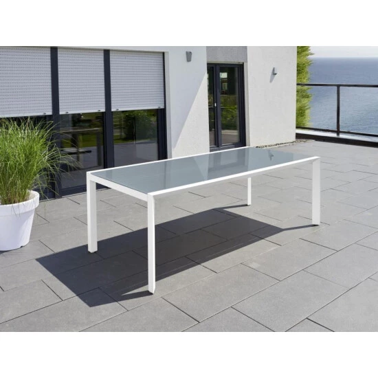 Gartentisch Stockholm – Gestell aus Aluminium, pulverbeschichtet – weiß – Tischplatte aus Glas – grau – Maße: 210 x 100 x 75 cm – Gewicht: ca. 44 kg SerieStockholmTischMaterialMaterialAluminiumObjekttauglich:Nicht bekanntklappbar:Neinausziehbar:NeinFarbe Gestell:WeissForm:RechteckigTischplatte:GlasGestell:Metall