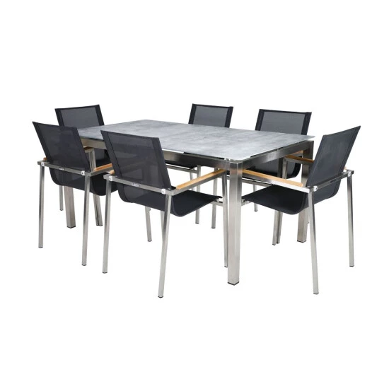 - 7-teilige, stilvolle Sitzgruppe bestehend aus 1 Tisch in schöner Stein-Optik und 6 Stapelsesseln in attraktiver Material-Kombination – Blickfang für Outdoor- und Indoor-Bereiche