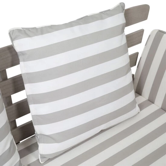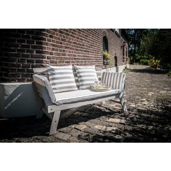 Die Multifunktionsliege „Hawaii setzt neue Maßstäbe im Garten. Hinter dem Gartenmöbel in Form einer Bank versteckt sich Sitz- und Liegegelegenheit zugleich. Es bietet mit seinen grau-weiß gestreiften Polsterauflagen einen Komfort der Extraklasse und lädt zum Verweilen unter dem Baum, auf der Terrasse, vor dem Gartenhaus usw. ein. Wer es sich besonders bequem machen möchte, verwandelt das formschöne 2- Sitzer-Sofa einfach in eine gemütliche Liege. Hierzu können die Armlehnen mit nur wenigen Handgriffen abgeklappt werden. Ein echtes Highlight für den In- und Outdoor-Bereich.