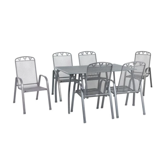 Diese schöne, robuste, wetterfeste und ansehnliche 7 teilige Gartengruppe aus der Serie Toulouse besteht aus sechs bequemen Stapelstühlen und einem großen Tisch.