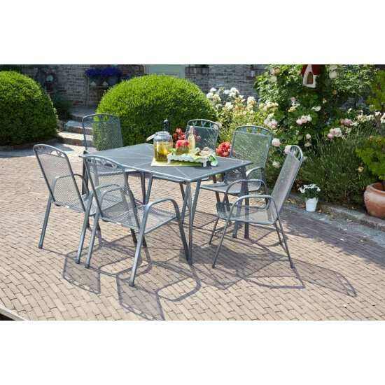 Die hochwertigen Stapelstühle und der Tisch dieser robusten und zeitlosen Erfolgsserie bestechen durch das klassische Design. Alle Möbel sind besonders robust und zugleich bequem. Sowohl die Stahlrohrgestelle als auch die Streckmetallelemente von Sitzfläche, Rückenlehne und Tischplatte sind wetterfest mit Kunststoff ummantelt. Die Stühle sind platzsparend stapelbar und mit einer dekorativen Verzierung an der Rückenlehne versehen. Die geschwungenen Tischbeine verleihen dem Tisch eine leichte Optik, ein höhenverstellbarer Fuß ermöglich das sichere und wackelfreie Aufstellen des Tisches. Diese Sitzgarnitur ist robust, pflegeleicht, langlebig und dazu noch sehr hübsch und unaufdringlich zu jeder Gartengestaltung passend.