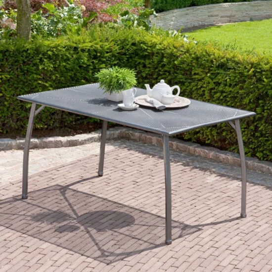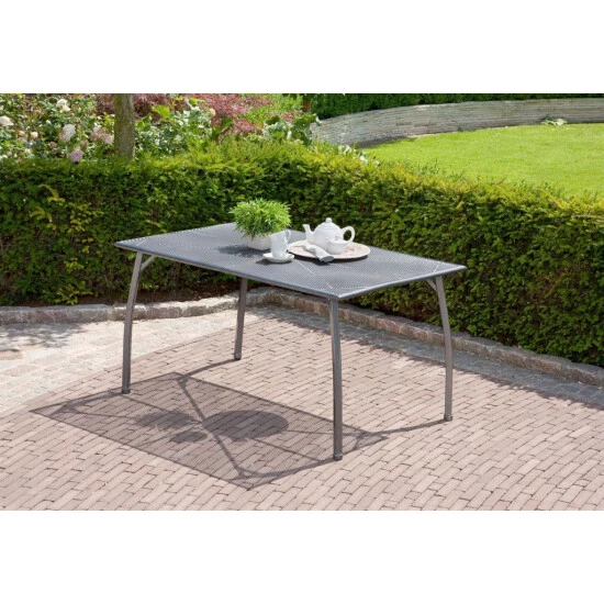 Gartentisch Toulouse Stahlrohrgestell oval Tischplatte aus Streckmetall eckig abgerundete Kanten mit Höhenausgleich wetterfest durch Kunststoffummantelung Farbe: eisengrau Maße: L 140 x B 90 x H 74 cmSerieToulouseTischMaterialMaterialMetallObjekttauglich:Nicht bekanntklappbar:Neinausziehbar:NeinFarbe Gestell:EisengrauForm:Rechteckig131 140 cmTischplatte:MetallGestell:Metall