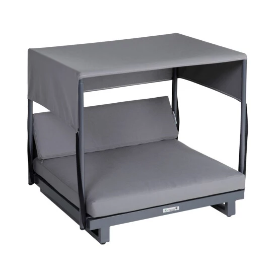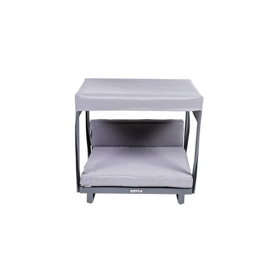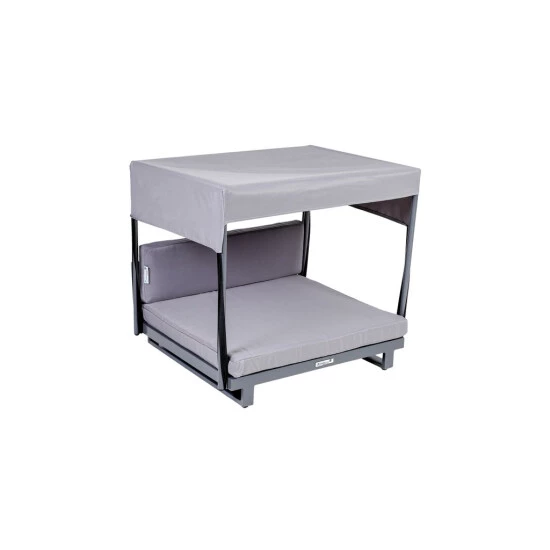 Hier nimmt der Vierbeiner gerne Platz: Das raffinierte Haustier-Sofa mit Dach sorgt für mehr Komfort und passt zudem hervorragend in den Garten. Neben der Aluminium-Lounge von Frauchen und Herrchen macht sich das Möbelstück besonders gut, denn mit seinem grauen Alu-Gestell passt es bestens zu diversen Outdoor-Einrichtungen. Ergänzt wird das moderne Äußere von einem ca. 6 cm starken, grauen Sitzkissen aus 100 % Polyester. Sein Bezug ist dank Reißverschluss abnehmbar und kann bei bis zu 40 °C gewaschen werden. Das Hunde-Bett verfügt über einen rückseitigen Rahmen für besonders anlehnungsbedürftige Tiere – ergänzt von einem schmalen Kissen. Ausgestattet mit einem Dach bietet das stilvolle Möbel auch bei Sonnenschein etwas Schatten. Es misst ca. 63 x 30/65 x 65 cm und eignet sich optimal für kleinere Hunde, aber auch Katzen. Einfach tierisch.