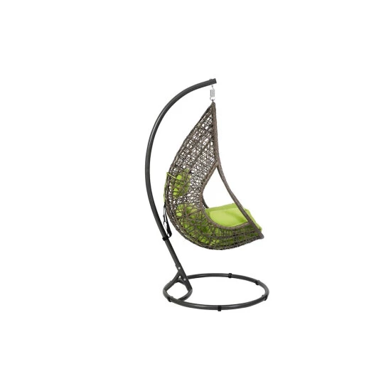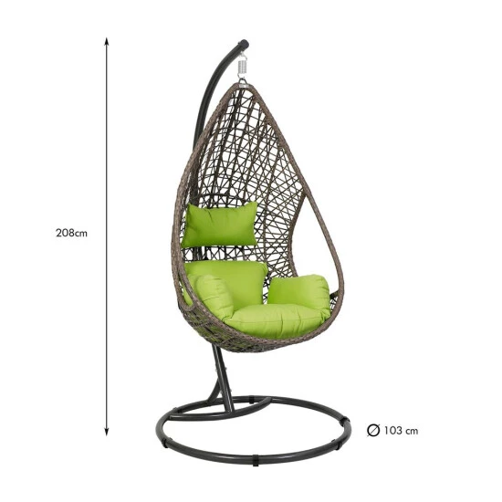 Hängesessel Kuba Maße: Ø ca. 208 x 103 cm (Sesselkorb: ca. 89 x 140 x 79 cm) Material: Stahl, Polyethylengeflecht, 180g/m² Polyester Kissen Farbe: brauner Korb/Gestell: anthrazit Kissenfarbe: grün