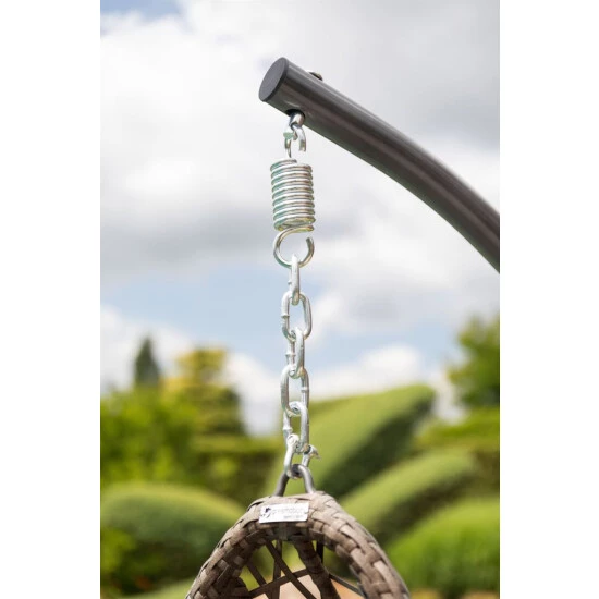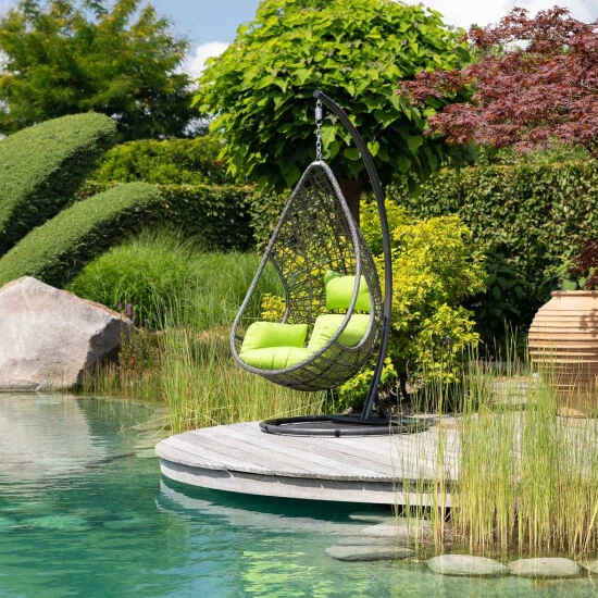 - Moderner Hängesessel in Tropfenform auf stabilem, rundem Fußständer – formschön gestaltet mit geneigter Sitzfläche – im Innen- und Außenbereich einsetzbar
