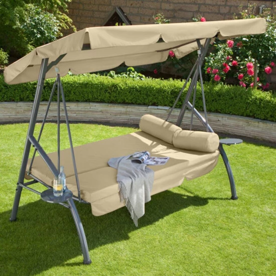 Hollywoodschaukel Sylt mit Bettfunktion und zwei schwenkbaren Ablagetabletts, anthrazit/sand, Stahl/Polyester, Maße: ca. 212 x 120 x 167 cm, Liegefläche: ca. 165 x 100 cm, ca. 165 x 48 x 53 cm, ca. 27,5 kg