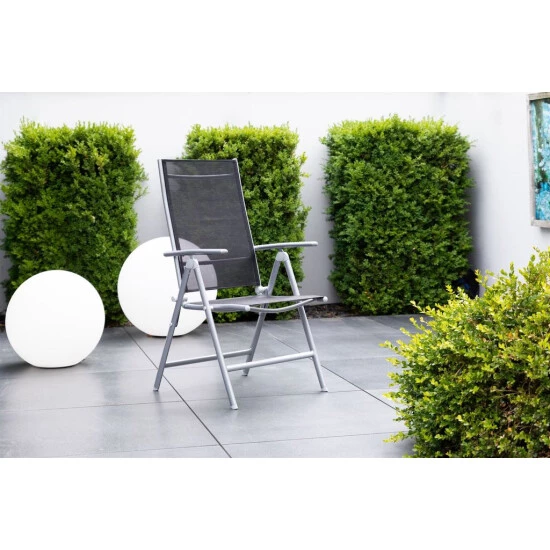 Individuell relaxen: Mit dem bequemen Klappsessel Chur ein Leichtes. Dank 7-fach verstellbarer Rückenlehne kann man sich hier gemütlich zurücklehnen und hervorragend die Seele baumeln lassen. Das stilvolle Möbelstück passt mit seinem silberfarbenen, langlebigen Aluminium-Gestell und der schwarzen Textilene-Bespannung zu zahlreichen Einrichtungen und anderen Outdoor-Möbeln – optimal für Garten, Wintergarten, Balkon oder Terrasse. Neben dem modernen Farb-Mix überzeugt der Stuhl mit seiner Klappfunktion, die eine platzsparende Unterbringung in Garage, Keller & Co. ermöglicht. So ist die Sitzgelegenheit im Winter gut verstaut und lässt noch genügend Stellfläche für weitere Möbel und vieles mehr. Der Klappsessel bereitet alleine Freude, aber auch mehrere der Stühle finden in einer Sitzgruppe Platz und sorgen somit für ein gemütliches Zusammensein mit Familie und Freunden – eine Bereicherung für draußen und drinnen.