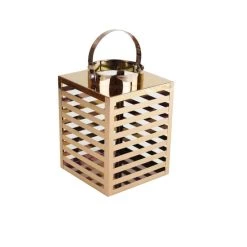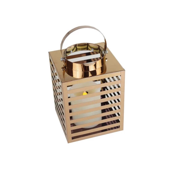 Erzeugen Sie Wärme und Gemütlichkeit in Ihrem Zuhause oder verschönern Sie Ihren Garten mit dieser attraktiven Laterne. Die Laterne ist aus schönem kupferfarbenem Metall gefertigt und lässt sich somit auch ideal mit einer Vielzahl an weiteren kupferfarbenen Dekoartikeln kombinieren. Dekoration in der Farbe Kupfer wird immer beliebter und stellt einen neuen Trend dar, gerade bei der Gartengestaltung. Die Laterne hat die Maße ca. 14,5 cm x 14,5 cm x 20 cm. Das Strebendesign verleiht der Leuchte ein modernes und einzigartiges Aussehen. Der praktische Tragegriff macht ein leichtes Transportieren möglich, aber beachten Sie, dass Metall ein guter Wärmeleiter ist und sich der Tragegriff erwärmt. Verwenden Sie in der Laterne nur Kerzen oder Teelichter und sorgen Sie dafür, dass die Laterne sicher steht. Setzen Sie einen tollen Blickfang mit dieser außergewöhnlichen Laterne.