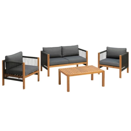 Exklusiv: Mit seinen stylischen Ropes wird das Lounge-Set Abaco zum Hingucker in jeder Umgebung – indoor wie outdoor. Der elegante, schwarze Farbton unterstreicht das besondere Etwas der modernen, schmalen Seile aus 100 % Polyester, die die Möbel perfekt in Szene setzen und zudem UV-beständig und reibecht sind. Um die Witterungsbeständigkeit zu unterstützen, empfehlen wir regelmäßige Behandlungen mit Holzpflegeöl. Zusätzlicher Blickfang ist die geradlinig gestaltete Lattung der Tischplatte, die das zeitgemäße Design gekonnt betont. Bis zu 4 Personen finden auf den schönen Sitzgelegenheiten Platz, die mit grauen, ca. 10 cm starken Kissen aus 100 % Polyester ausgestattet sind und für maximalen Komfort sorgen. Das Set ist zudem zerlegbar und kann daher platzsparend verstaut werden – das neue Lieblingsstück für Garten, Wintergarten, Terrasse oder Sitzecke.