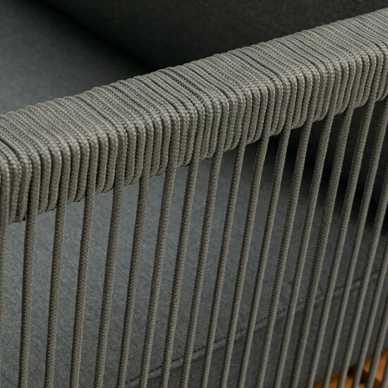 Moderne Garten-Lounge mit hochwertigen, stylischen Ropes an den Armlehnen, bestehend aus 1 Bank, 2 Sesseln und 1 Tisch – mit gemütlichen Kissen für maximalen Komfort