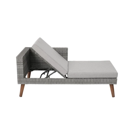 3-teiliges, gemütliches Lounge-Set aus 2 Bänken und 1 Hocker/Tisch – 1 Bank mit verstellbarer Kopfstütze, in die Sitzfläche integriert, für flexible Sitz-/Liegepositionen Hocker auch als Tisch verwendbar – perfekt zum Ablegen bzw. -stellen von Tabletts, Snacks, Zeitungen und Zeitschriften, Büchern, Sonnenbrillen usw. – Füße in Holz-Optik Aluminium-Gestell mit PE-Geflecht, doppelt halbrund, pflegeleicht und strapazierfähig, schmutz- und wasserabweisend, Farbe: anthrazit, Auflagen: 100% Polyester, Farbe: grau Ideal einsetzbar im In- und Outdoor-Bereich, zum Beispiel in Garten oder Wintergarten, auf der Terrasse oder im Wohnraum – auch als Sitzgruppe für das Wohnzimmer geeignet Maße: Bänke ca. 150 x 64 x 75 cm, Hocker/Tisch: ca. 64 x 32 x 75 cm, Gewicht: ca. 40 kg, max. Belastbarkeit: 3x ca. 110 kg plus 1x ca. 110 kg (Hocker) Gemütlichkeit an erster Stelle: Auf den Bänken und dem Hocker des einladenden Lounge-Sets „Gomera nimmt man gerne Platz. Es verspricht maximale Entspannung in Sitz- und Liegeposition, denn eine Bank verfügt über eine 5-fach verstellbare Kopfstütze. Diese ist in die Sitzfläche integriert, sodass die Konstruktion bei Nichtnutzung gut getarnt ist. Zusätzlich stellt der Hocker eine weitere Sitzgelegenheit dar, er kann aber auch einfach zum bequemen Hochlegen der Füße genutzt werden. Das Möbelstück kann zudem als praktische Ablage verwendet werden. Hier finden Snacks, Zeitschriften & Co. Platz und sind immer griffbereit. Das stilvolle Trio macht nicht nur dank der praktischen Vorteile eine gute Figur, sondern fällt auch optisch ins Auge. Es kombiniert PE-Geflecht in der Farbe Anthrazit mit Füßen in Holz-Optik, was ihm ein elegantes Äußeres verleiht. Mit den grauen, ca. 8 cm hohen Sitzauflagen wird der ansprechende Look komplettiert. Die Sitzgruppe für in- und outdoor setzt sich in Garten oder Wintergarten, auf der Terrasse, aber auch im Wohnraum gekonnt in Szene – ein Schmuckstück.