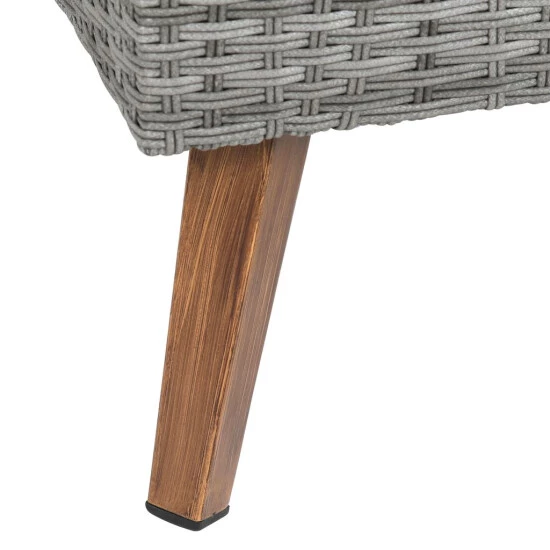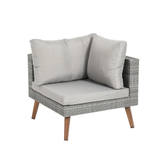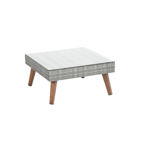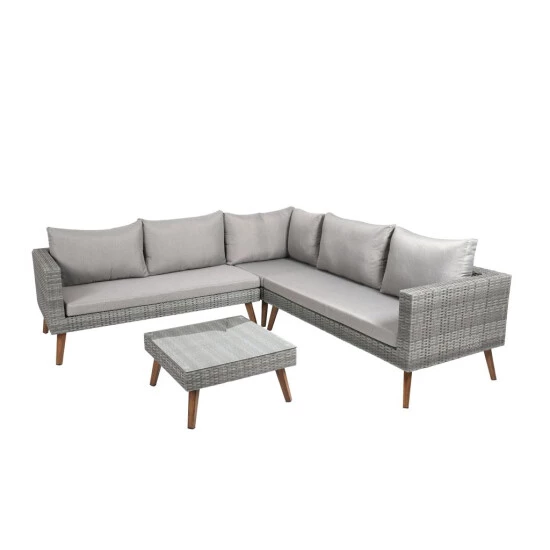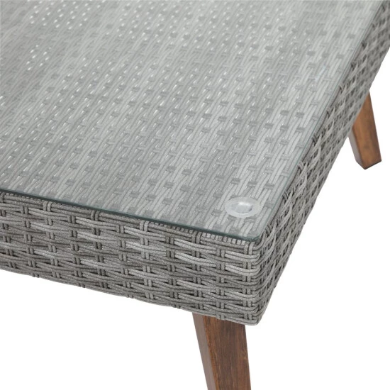 - Leichtes Aluminiumgestell mit strapazierfähigem Polyethylengeflecht in Grau, Alufüße in Holzoptik, Tischplatte aus Glas, Stärke ca. 5 mm, Sitz- und Rückenkissen aus 100 % Polyester (180 g/m²), Bezüge waschbar bis 30 °C