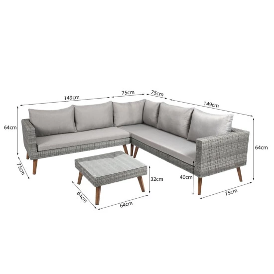 - Maße: 2 x Bank: je ca. 150 x 75 x 64 cm, Ecksessel: ca. 75 x 75 x 64 cm, Tisch: ca. 64 x 64 x 32 cm, Gewicht: ca. 40 kg