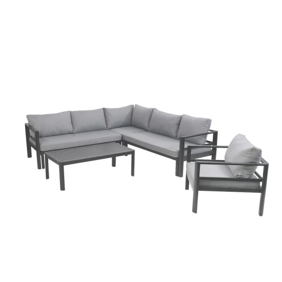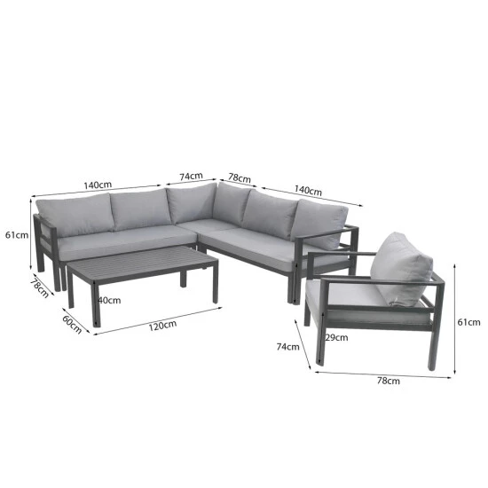 Lounge-Set Levante Sofas seitlich ausziehbar, mit steckbaren Seitenteilen für die ausgezogenen Seitenteile (Rückenlehnen) Maße: ca. 140 x 61 x 78 cm (2x 2er Sofa) ca. 78 x 61 x 78 cm (1x Eckteil) ca. 78 x 61 x 78 cm (1x Stuhl) ca. 120 x 40 x 60 cm (1x Tisch) Sitzmaße: ca. 135 x 29 x 78 cm (Sofa) ca. 73 x 29 x 78 cm (Ecksessel) ca. 73 x 29 x 78 cm (Sessel) ca. 120 x 40 x 60 cm (Tisch) Material: Aluminium, 100% Polyester (Kissen) Farbe Gestell: anthrazit Farbe Kissen: grau Kissenstärke: ca. 8 cm Gewicht: ca. 45 kg max. Belastbarkeit: 7 x 110 kg Karton 1: ca. 149,5 x 85,5 x 63,5 cm Karton 2: ca. 81 x 63,5 x 10 cm