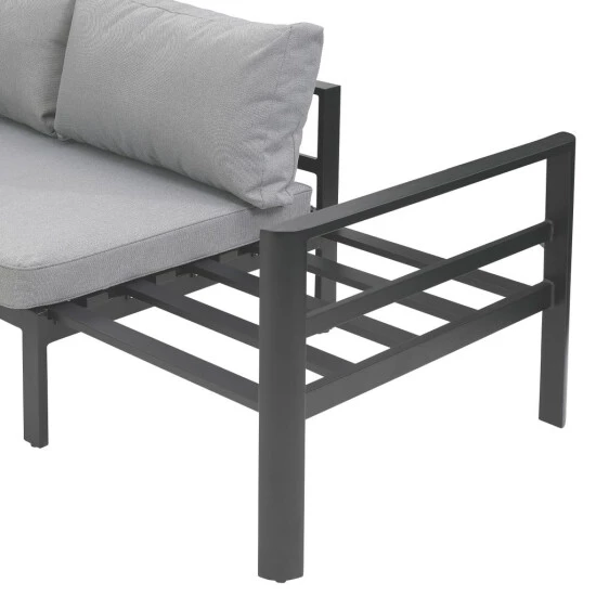 Das neue Lieblingsdraußen – die funktionelle Lounge „Levante“ präsentiert sich von der besonders vielfältigen Seite. Sofas, Sessel und Tisch sind in vielerlei Hinsicht variabel zusammenstellbar: Die einzelnen Elemente können ganz unterschiedlich arrangiert werden, sodass sie sich in verschiedenen Raumsituationen und zu diversen Zwecken individuell einrichten lassen. Die Sitzgelegenheiten lassen sich zum Beispiel über Eck, gegenüberliegend oder einzeln platzieren. Clever: Beide Bänke sind einseitig mit einer Armlehne versehen und können an dieser Flanke ausgezogen und daher praktisch vergrößert werden. Somit ergeben sich zusätzliche Sitzplätze oder Ablageflächen, zum Beispiel für Tabletts und Bücher. Sinnvolle Ergänzungen sind die beiden steckbaren Rückenteile, die im Lieferumfang enthalten sind. Gemeinsam mit dem attraktiven Lounge-Tisch in Lattenoptik wird die Sitzgruppe zum Highlight der Saison. Sie besteht aus einem leichten, anthrazitfarbenen Aluminiumrahmen und ist mit gemütlichen, grauen Kissen ausgestattet, die für Extra-Sitzkomfort sorgen – in- wie outdoor ein echter Blickfang.