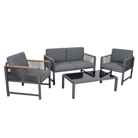 Stilvoll genießen: Mit dem schicken Lounge-Set Nevi lässt es sich wunderbar im Outdoor- und Indoor-Bereich entspannen. Die geradlinig gestaltete Möbel-Kombination ist ein absoluter Blickfang – im (Winter-)Garten, auf der Terrasse, dem großen Balkon wie auch im Wohnzimmer. Die Garnitur besteht aus einer Bank, zwei Sesseln und einem dekorativen Tisch. Hingucker: Die Ropes an den Armlehnen, die zusätzlich mit ihrer attraktiven Holz-Optik ins Auge fallen. Weiter Pluspunkt sind die gemütlichen Kissen mit einer Stärke von ca. 8 cm im Sitzbereich sowie ca. 10 cm für den Rücken. Sie bestehen aus 100 % Polyester und sind in der Farbe Grau gehalten – passend zu der Tischplatte und dem dunkelgrauen Aluminium-Gestell. Für einen eleganten Kontrast sorgen die Armlehnen aus einem Holz-Kunststoff-Gemisch. Insgesamt bietet das moderne Set Platz für bis zu vier Personen – ideal für gesellige Runden mit Familie und Freunden.
