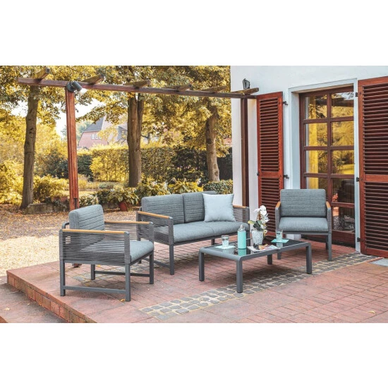 - Stilvolles Lounge-Set Nevi bestehend aus einer Bank, zwei Sesseln und einem Tisch – Sitzgelegenheiten mit modernen Ropes an den Armlehnen als attraktiver Blickfang