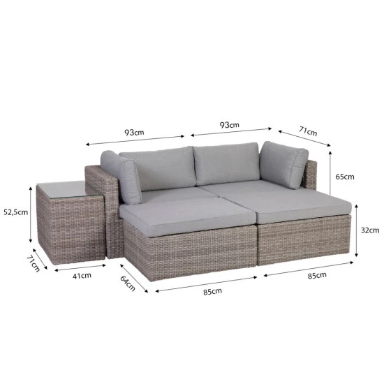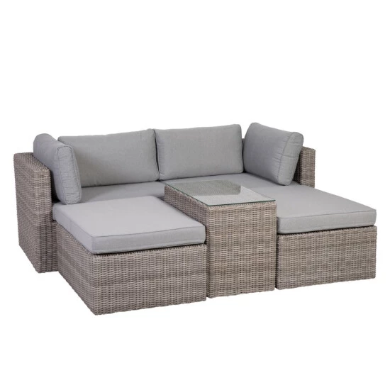 Maximale Kombinationsvarianten bietet das einladende Lounge-Set Palma. Da es aus fünf Einzelmöbeln besteht, lässt es sich ideal als Sofa mit Tisch und zwei weiteren Sitzgelegenheiten arrangieren. Aber auch als Liegeinsel mit seitlich oder zwischen die Hocker gestelltem Tisch kommt es groß heraus. Praktisch: Bei Nichtgebrauch können die einzelnen Möbel platzsparend gestapelt werden – und nehmen wenig Raum in Garage, Keller oder Gartenhaus ein. Die attraktiven Möbelstücke machen sich in- wie outdoor hervorragend und sind somit bestens auf der Terrasse wie auch im Wintergarten zu platzieren. Mit dem modernen, kantigen Tisch wird die Lounge komplettiert. Dieser ist mit einer Sicherheitsglasplatte ausgestattet, durch die das schöne Polyethylengeflecht darunter optimal zur Geltung kommt. Alle Set-Bestandteile bestehen aus einem Stahlgestell und sind mit strapazierfähigen Kunststofffasern (Polyrattan) umflochten, die sich durch eine gute Beständigkeit gegen Witterungseinflüsse und UV-Strahlung auszeichnen. Damit sind sie die perfekte widerstandsfähige und pflegeleichte Alternative zu Naturrattan. Das Gartenmöbel-Set verfügt zudem über bequeme graue Sitz- und Rückenkissen – der neue Lieblingsplatz zum Entspannen für drinnen und draußen.