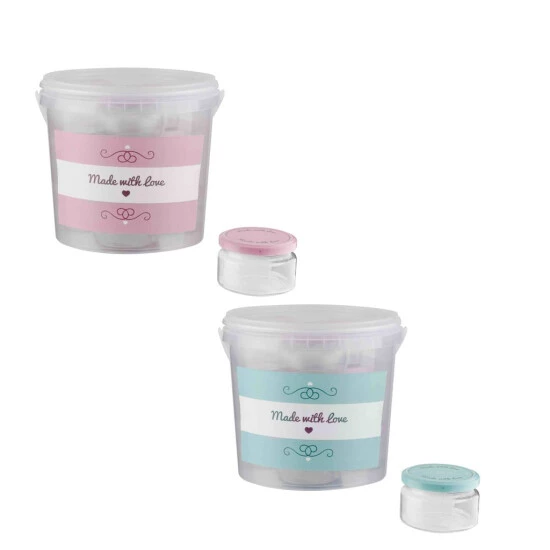 Pflückeimer mit Gläsern 10 Gläser im Set mit Pflückeimer, „Made with love“ Deckel, pink und blau ca. 250 ml je Glas sortiert keine Farbwahl möglich