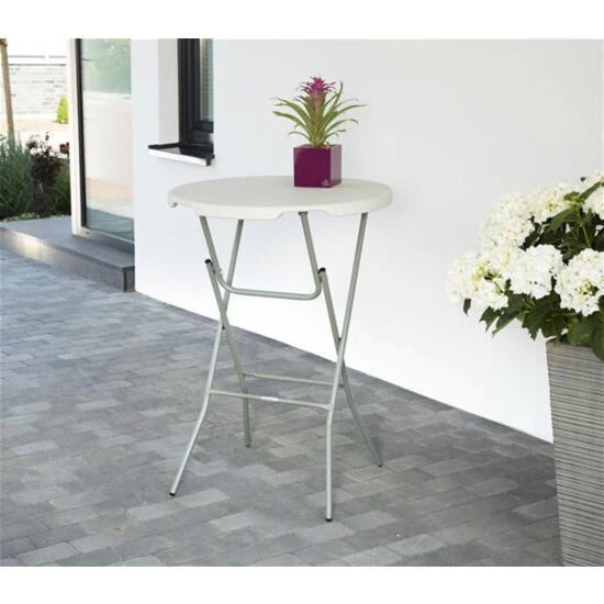 Steh-/Klapptisch; klappbar, mit Sicherheitsbolzen; Farbe: grau/sand; Material: Stahl, Kunststoff; Artikelmaße: ca. Ø 80 cm, Höhe: 111 cm; Artikelgewicht: ca. 6,8 kg