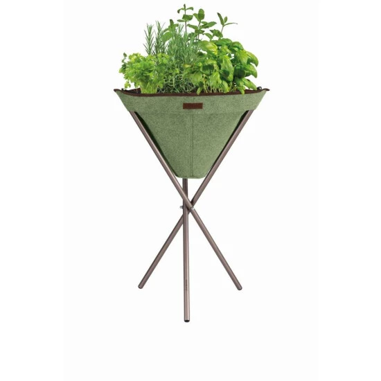 Tripott Drei-Bein Alu-Gestell braun eloxiert mit herausnehmbarem Pflanzbeutel aus 3-schichtigem Vlies mit eingenähtem Tunnelzug, sorgt für optimales Wurzelklima und eine verbesserte Wurzelstruktur, perfekte Arbeitshöhe zum urbanen Gärtnern, für Kräuter, Gemüse oder Zierpflanzen ein stilvoller Hingucker auf jeder Terrasse und jedem Balkon moosgrün, ca. 50 x 45 x 78 cm, Volumen ca. 12 Liter