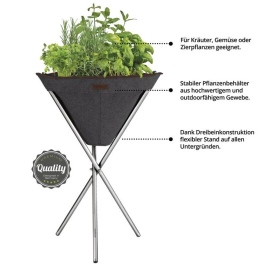 Tripott Drei-Bein Edelstahl-Gestell, mit herausnehmbarem Pflanzbeutel aus 3-schichtigem Vlies mit eingenähtem Tunnelzug, sorgt für optimales Wurzelklima und eine verbesserte Wurzelstruktur, perfekte Arbeitshöhe zum urbanen Gärtnern, für Kräuter, Gemüse oder Zierpflanzen, ein stilvoller Hingucker auf jeder Terrasse und jedem Balkon anthrazit, ca. 50 x 45 x 78 cm, Volumen ca. 12 Liter