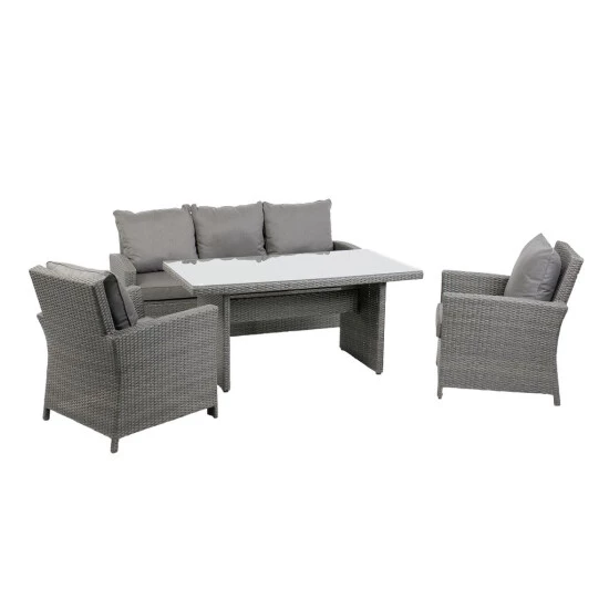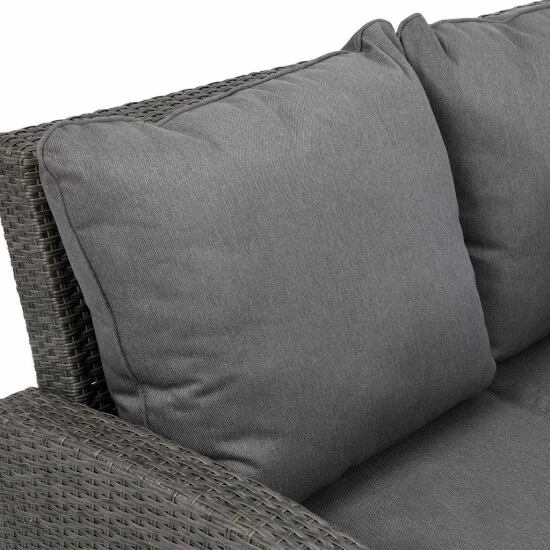 Material: Aluminium, flaches Polyrattan, Polyester (Kissen), Glas (5 mm) Maße:, ca. 69,5 x 82,5 x 84 cm (Sofa), ca. 177 x 82,5 x 84 cm (Bank), ca. 140 x 65 x 70 cm (Tisch), Farbe Polyrattan: anthrazit, Farbe Kissen: hellgrau, Kissenstärke: ca. 8 cm