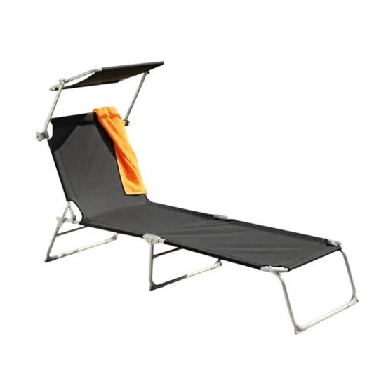 3-Bein-Strandliege Texel mit Dach Aluminiumgestell silber Bespannung Textilene schwarz wasser und schmutzabweisend pflegeleicht verstellbare Rückenlehne Stellmaß ca. 188 x 61 x 28 cm Liegefläche ca. 186 x 59 x 29 cm Gewicht ca. 4,5 kg belastbar bis max. 90 kgPolstertypLiegeLagerungKlappbarObjekttauglichNeinTextilgewebeFarbe Gestell:SilberGestell:AluminiumLiegeMaterialMaterialAluminium